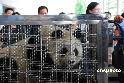10月22日,兩只國(guó)寶級(jí)大熊貓“樂山”、“珍大”抵達(dá)杭州蕭山國(guó)際機(jī)場(chǎng),立即乘車去它們的新家——浙江安吉竹博園落戶。據(jù)飼養(yǎng)員史斌遞介紹,這兩只大熊貓來(lái)自四川成都大熊貓繁育研究基地,均為雄性,每只重約100公斤,年齡都大約在兩歲半左右,相當(dāng)于人類的八九歲。它們都很好動(dòng),愛爬樹,是熊貓家族里的“運(yùn)動(dòng)健將”。中新社發(fā) 夏毅 攝