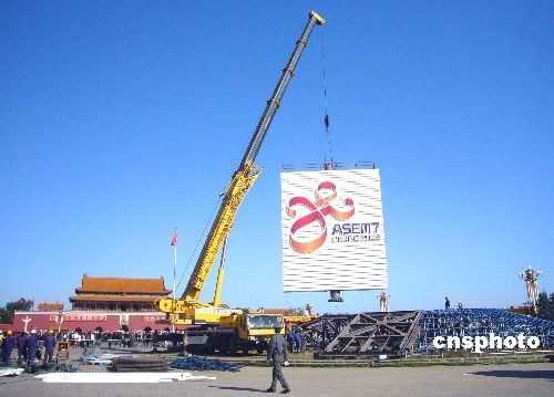 2008年10月27日上午,北京天安門廣場,施工人員開始吊卸第七屆亞歐首腦會(huì)議標(biāo)識,整個(gè)中心花壇的拆除工作正在加緊進(jìn)行,預(yù)計(jì)將于今晚全部拆卸完畢。今年的天安門廣場花壇布置從7月5日開始施工,經(jīng)歷奧運(yùn)會(huì)、殘奧會(huì)、國慶、第七屆亞歐首腦會(huì)四個(gè)時(shí)期,至今已歷時(shí)3個(gè)多月。這是自1986年廣場擺花以來,史無前例的。中新社發(fā) 玉龍 攝