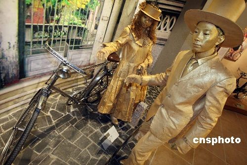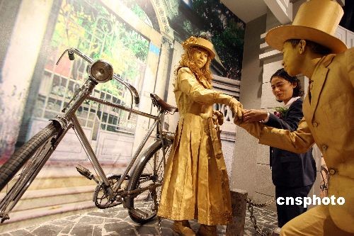 10月28日,行為藝術(shù)者在河北省霸州市新落成的華夏民間收藏館自行車博物館內(nèi)表演,表演者倚靠的是著名民間收藏家王明璽老人收藏的1910年英國生產(chǎn)的白金人牌自行車。該車只生產(chǎn)了100輛,進入中國10輛,這是目前發(fā)現(xiàn)保存最為完好的一輛。當日,第二屆霸州文化藝術(shù)節(jié)在河北省霸州市隆重開幕。中新社發(fā) 毛建軍 攝