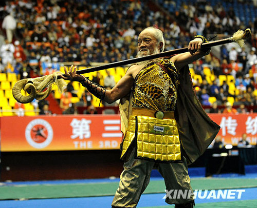 10月31日,88歲的劉子均在表演奇門兵器——羊角骶。當日,正在湖北省十堰市舉行的第三屆世界傳統武術節開始武術比賽。來自中國武術協會代表隊88歲的劉子均習武70多年,他在比賽中表演的羊角骶藝驚四座。新華社記者余國慶攝