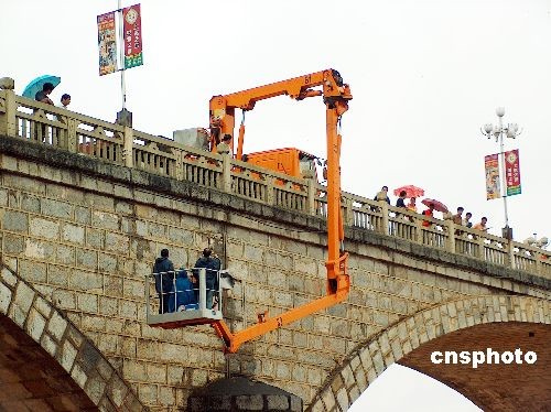 11月2日上午,廣西南寧公路局工程技術人員冒細雨為中國當代最長的石拱橋——--龍州大橋“把脈探傷”。龍州大橋建于上世紀60年代,為七拱方塊石料結構,橋長約252米。在通車的43年來,已經受了4次大洪水的考驗。中新社發(fā) 馮文 攝