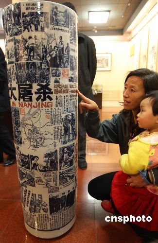 十一月四日,一件由百余幅南京大屠殺史實圖片燒制成的陶瓷作品《南京大屠殺》在北京汲古閣舉行的《繼承與創新景德鎮大師陶瓷精品展》上展出。由中國陶藝大師蔡世文創作的陶瓷作品《南京大屠殺》賦予陶瓷藝術崇高的靈魂,將中國古典文化與中華悲慘歷史相結合,給人以震撼。該作品榮獲08屆“瓷都杯”全國陶藝大賽金獎。中新社發 史利 攝