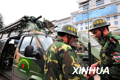 在云南楚雄等地發生滑坡泥石流災害后,云南民兵預備役應急通信分隊派出安裝著地理信息、GPS定位、衛星圖像傳輸、微波無線通信等車載工作系統組合的移動指揮車及數輛前方信息偵察車,用科技手段為救災工作提供精確信息和清晰圖像。新華社記者 陳海寧 攝
