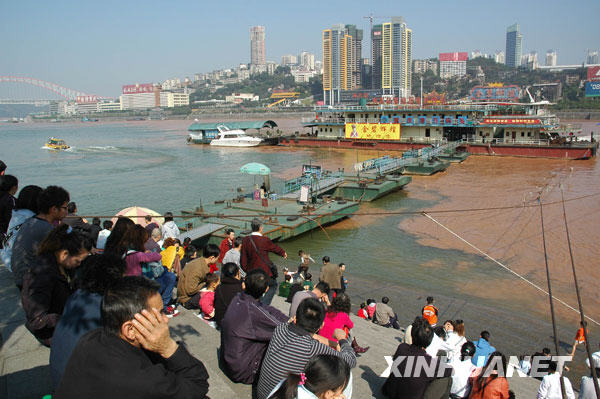 11月8日,受長江上游持續降雨和三峽工程實驗性高位蓄水影響,重慶朝天門港的嘉陵江、長江交匯處江水呈現一清一渾,涇渭分明。據了解,往年入冬時節長江、嘉陵江已進入枯水期,今年隨著三峽水庫蓄水,長江水位迅速上升,當日18時,重慶寸灘長江水位達到175.32米。 新華社發(周會 攝)