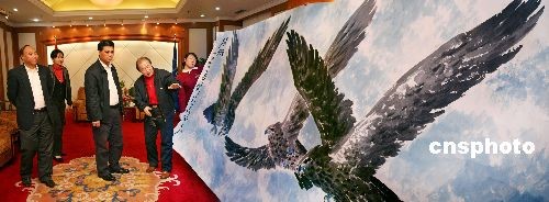 11月10日,全國政協委員、著名畫家王書平教授將一幅長5米、高2.1米,名為《騰飛》的國畫作品獻給了中國航天科技工作者,以此表達對中國航天人的崇敬。在這幅長達5米、高2.1米的畫作中,三只身姿矯健、形態各異的雄鷹代表三名航天英雄展翅翱翔在浩瀚天際。整幅作品畫面壯觀,氣勢磅礴,洋溢著一種傲視群雄的力量感,具有很強的感染力。 中新社發 王保勝 攝