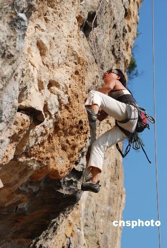 11月13日,一外國攀巖愛好者在廣西陽朔高田巖寺村白山攀巖。陽朔屬典型的喀斯特地貌,群山峻嶺連綿起伏,一個個獨立的山峰拔地而起。峭壁林立,可進行攀巖的地方比比皆是,是世界攀巖者心中的圣地,陽朔的攀巖路線從數量、質量和難度級別上來說都屬于中國之最。中新社發 周利朔 攝