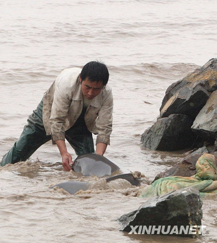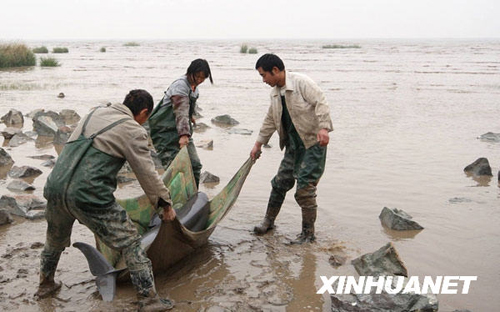 11月12日,3位漁民借助棉被將擱淺江豚轉移到安全地帶。 當日,在杭州灣海鹽段灘涂,一條擱淺江豚在3位漁民的及時幫助下,重回大海。新華社發