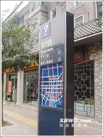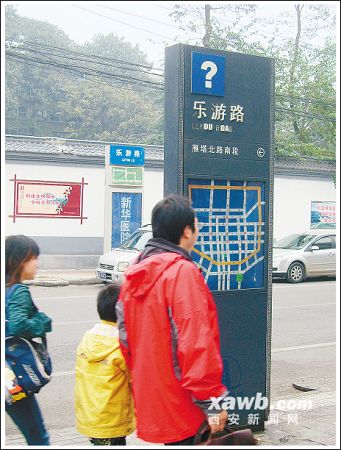 18日下午,大雁塔附近的育才路路口一個(gè)約2米高的黑色簇新路牌引人注目,不時(shí)有游客打扮的人上前查看道路信息。但是,路牌“育才路”三個(gè)漢字上方標(biāo)示的一個(gè)大大的白色“?”號(hào),引起了不少查看者的疑惑。兩名游客先是在路牌下方的城區(qū)交通旅游圖上尋找著“育才路”的方位,而后又仰頭看著“大問(wèn)號(hào)”撓起了頭:“咱們現(xiàn)在是在育才路上嗎?這不會(huì)是表示路名待定吧……”