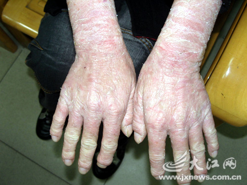 從生下來開始,全身皮膚就紅腫脫皮,現在已經23歲的余干縣余小姐的皮膚就像老人的皮膚一樣粗糙。