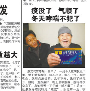 “患友介紹我服用了‘藏克’。服完第一盒,咳嗽、胸悶就緩解多了。”昨天(22日),看著我市(重慶市)某報上的一則藥品廣告,90歲高齡的老人張治欽感到納悶,“我從來沒得過這病,卻上了該藥的宣傳廣告。”