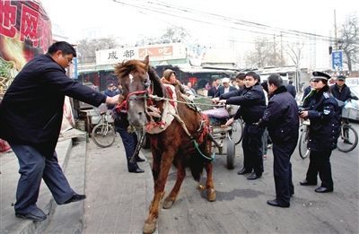 11月29日,一女商販駕馬車與城管“角力”。當(dāng)日9時許,這名賣橘子的女商販與同伴被宣武城管廣外分隊(duì)查獲。女商販趁人不備坐上馬車,一抖韁繩命令拉車黃馬躥向周圍圍觀的人群。幸有便衣工作人員(左)與城管死死拉住,才未釀出大禍。(周民 袁國禮)