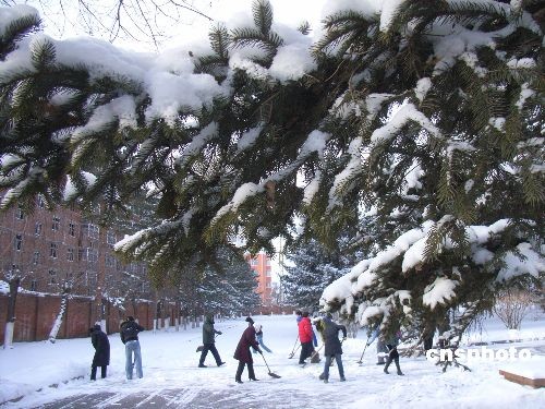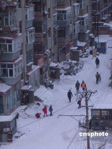 2008年12月4日,齊齊哈爾市再次降雪,城市銀裝素裹。當(dāng)?shù)貧庀笈_(tái)發(fā)布藍(lán)色寒潮預(yù)警信號(hào),提醒市民做好預(yù)防寒潮準(zhǔn)備。齊齊哈爾市已經(jīng)連續(xù)兩天降雪,降雪給城市交通帶來(lái)了不便,車輛紛紛緩行,市民忙著清掃道路上的積雪。中新社發(fā) 王云龍 攝