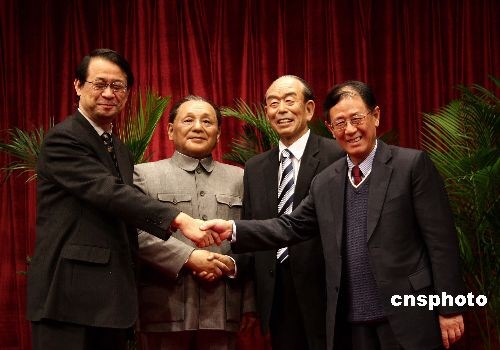 12月5日,中國人民和平外交促進會、炎黃子孫熱愛祖國聯合會、中國偉人蠟像館等,在北京人民廣播電臺大廈啟動“平福中日,世代之約”活動。中國人民和平外交促進會會長胡德平、日本國大使館公使泉裕泰參加了活動。活動儀式上,中國人民向日本人民贈送了一份特殊意義的禮物——以蠟像藝術形式再現30年前鄧小平和福田赳夫簽訂“中日和平友好條約”的歷史時刻。中新社發 張愛東 攝