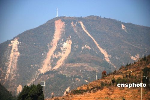 12月,在四川青川縣關莊鎮的白石河停車場可以清晰地看到遠山滑坡體垮出的“青川”二字。中新社發 熊芙蓉 攝