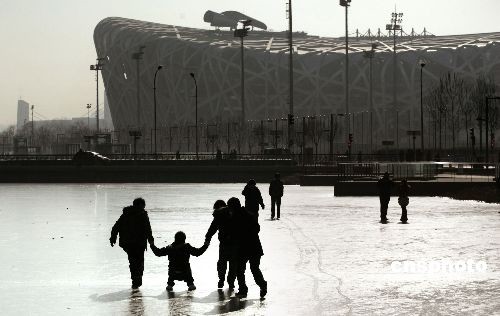 十二月中旬,北京“鳥巢”外的景觀湖已經封凍,民眾在冰面上快樂嬉戲。中新社發 廖攀 攝