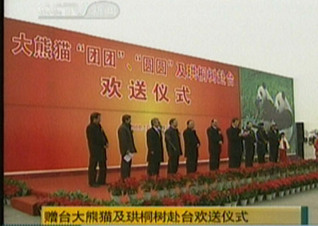 12月23日,贈(zèng)臺(tái)大熊貓“團(tuán)團(tuán)”“圓圓”及珙桐樹赴臺(tái)歡送儀式在四川成都雙流機(jī)場(chǎng)舉行。