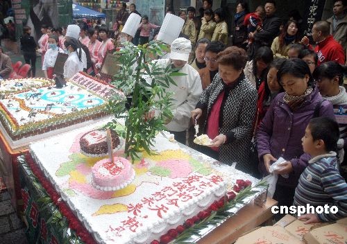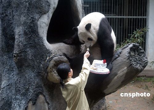 5.12汶川大地震使四川臥龍大熊貓中心受到嚴重破壞,首批四只“災區熊貓”被疏散安置到福州熊貓世界,經過半年的治療休養已適應了福州生活,身體與精神狀態逐步恢復到震前情況。為了讓“災區熊貓”過好新年,2008年12月28日 ,福州熊貓世界舉行了主題為“災區熊貓,新年好”的熊貓和諧世界活動紀念月活動,讓更多市民一起來關愛災區大熊貓。中新社發 張 斌 攝