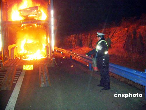 1月10日凌晨,一輛運載著8輛海南馬自達轎車的大貨車,在湖北樊魏高速公路上無故起火,除搶救出一臺轎車外,其余7臺“海馬”燒成空殼。原來,駕駛員李某準備將8輛海南馬自達3型轎車從重慶運往吉林,途中發現裝有兩層車的下層,有一臺馬自達轎車起火,李某驚慌之下急忙救火。在民警的幫助下,駕駛員搶出一輛未著火的轎車,其余7輛轎車全部燒得只剩空殼。民警現場調查發現,火是起自下排一臺小轎車,懷疑是轎車自燃,但轎車本身并未發動,究竟如何起火,讓民警和司機都納悶不已。目前,該事故成因正在調查中。 中新社發 李得榮 攝