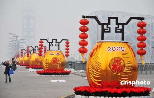 2009年1月21日,北京奧林匹克公園中軸線兩側安置的眾多巨型落地燈籠為即將到來的牛年春節增添了濃濃的喜慶氣氛,也吸引了眾多游客拍照留念。中新社發 樊甲山 攝