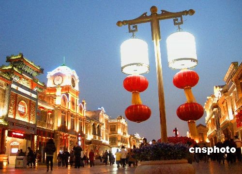 2009年2月7日(農(nóng)歷正月十三),大紅燈籠懸掛北京前門(mén)大街,迎接元宵佳節(jié)到來(lái)。據(jù)悉,2月9日(農(nóng)歷正月十五),前門(mén)大街將舉行元宵節(jié)踩街活動(dòng),來(lái)自北京、河北、山東的花會(huì)隊(duì),將從正陽(yáng)門(mén)箭樓南側(cè)和前門(mén)五牌樓之間被彩綢包圍的“儀式場(chǎng)”出發(fā)。16只南獅和北獅將為大隊(duì)人馬開(kāi)道,隨后,中幡、旱船、二魁摔跤、地秧歌、鼓子秧歌等將依次向珠市口行進(jìn)。中新社發(fā) 玉龍 攝