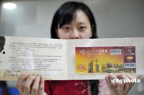 2月23日,10萬(wàn)冊(cè)《杭州市市民消費(fèi)券珍藏冊(cè)》在杭州公開(kāi)發(fā)行。1月20日起,杭州市向全市六城區(qū)67萬(wàn)特殊人群發(fā)放了1億元消費(fèi)券,在過(guò)去的一個(gè)月內(nèi),已經(jīng)十分有效地達(dá)到了“保障民生,拉動(dòng)消費(fèi)”的目標(biāo)。在此前提下,為滿足廣大市民珍藏消費(fèi)券,保存這份特殊記憶的要求,市財(cái)政部門特別制作并發(fā)行10萬(wàn)冊(cè)《杭州市市民消費(fèi)券珍藏冊(cè)》,每?jī)?cè)收藏五張“杭州市民消費(fèi)券”,每張面值20元,價(jià)值100元,整冊(cè)發(fā)行價(jià)亦為100元人民幣。冊(cè)內(nèi)消費(fèi)券不僅具有收藏價(jià)值,也可以憑券消費(fèi),同時(shí)享受商家提供的優(yōu)惠服務(wù)。中新社發(fā) 李忠1 攝