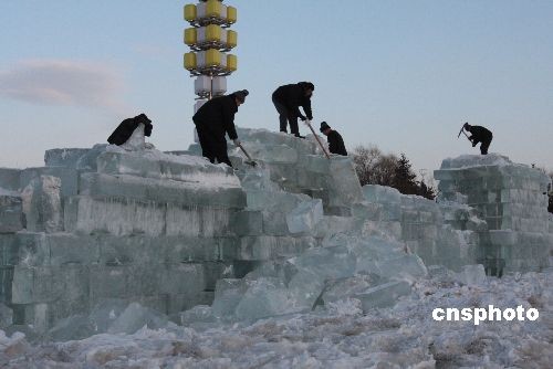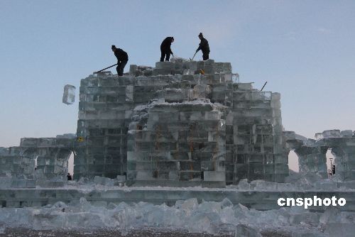 2月28日,施工人員在牡丹江市城區(qū)冰堡旅游景點拆除融化的冰雕作品。“立春”過后,素有“雪城”之稱的黑龍江省牡丹江市氣溫回升較快,城區(qū)內(nèi)的各大冰雪旅游景點的冰雪作品開始融化,失去寒冬里的風(fēng)采。從當(dāng)日起,城區(qū)冰雪旅游景點管理部門對融化的冰雕作品進(jìn)行拆除。中新社發(fā) 莊文斌 攝