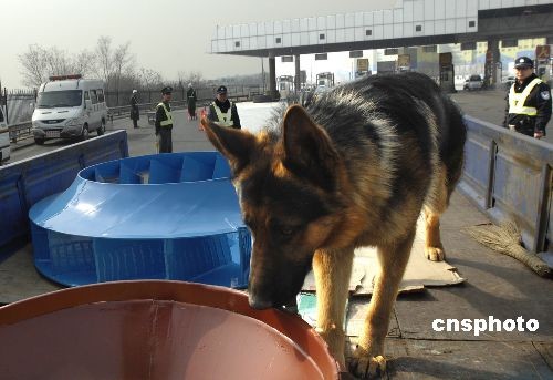 近日,北京豐臺警方在京石高速公路杜家坎收費站治安檢查站采取警員與警犬一同進行安全檢查的措施,確保萬無一失。 杜家坎收費站位于豐臺西部和房山東部的交界地帶,地理位置非常重要,是京石高速公路進入市區的必由之路,每天的車流量很大。中新社發 楊陽 攝