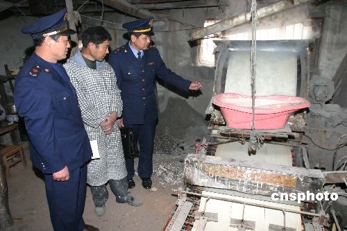 3月19日,江蘇連云港墟溝工商所在連云區(qū)城鄉(xiāng)結(jié)合部簡(jiǎn)明平房查處一無(wú)證煎餅黑作坊。執(zhí)法人員現(xiàn)場(chǎng)發(fā)現(xiàn),原料庫(kù)內(nèi)堆放著做煎餅的原料,原料包裝物上沒(méi)有任何標(biāo)志,無(wú)合格證。加工間狹小、設(shè)備簡(jiǎn)陋,隱蔽在簡(jiǎn)易破舊的平房?jī)?nèi),做飯、加工于一體。場(chǎng)所內(nèi)兩口盛面糊的大缸周圍污穢不堪,污水遍地,衛(wèi)生狀況十分惡劣。煎餅主要送往城區(qū)市場(chǎng)、學(xué)校周邊及工業(yè)區(qū)外來(lái)人員上班經(jīng)過(guò)的地方銷售。執(zhí)法人員當(dāng)即責(zé)令煎餅作坊停止生產(chǎn),并對(duì)加工機(jī)器予以查封。中新社發(fā) 王健民 攝