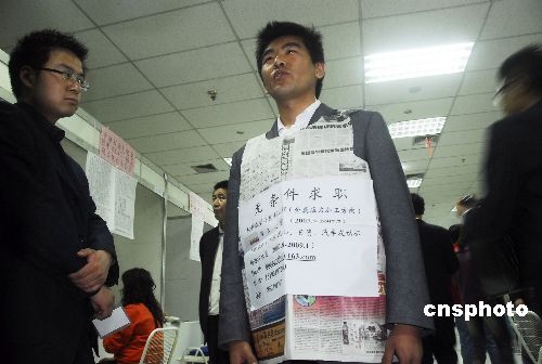 3月21日,“相約09”春季大型人才招聘會在蘭州市人才市場舉辦。在招聘會現場,一名身穿報紙做成馬甲的小伙子在胸前打的廣告是“無條件求職”,這位小伙子表示,為了生存他對工資、待遇和崗位都沒有要求,如果能和他的專業接近最好,如果不行讓他干什么都行。中新社發 巖石 攝