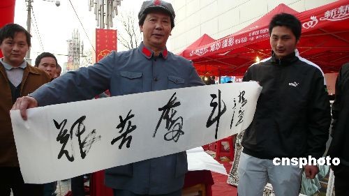 3月22日,幾位市民正在用手機(jī)給特型演員楊立達(dá)拍照。當(dāng)日,受安徽省亳州市一家企業(yè)邀請(qǐng),長(zhǎng)相酷似偉人毛澤東的特型演員楊立達(dá)在市區(qū)剛露面,就被許多市民團(tuán)團(tuán)圍著,并紛紛與他合影留念,楊立達(dá)還現(xiàn)場(chǎng)為市民揮毫潑墨,贈(zèng)送書法作品。中新社發(fā) 劉勤利 攝