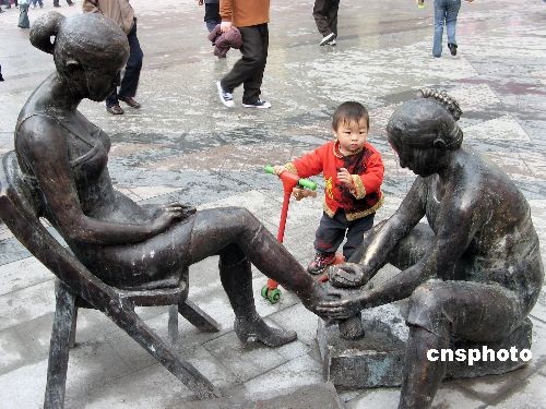 2009年3月23日,長江三峽港口城市湖北宜昌,碼頭工人、炸蘿卜餃子、賣魚和擦皮鞋的青銅雕塑逐漸在街頭安裝固定。普通市民生活鑄成銅雕,這在長江沿線還是首次。中新社發 韓玉洪 攝