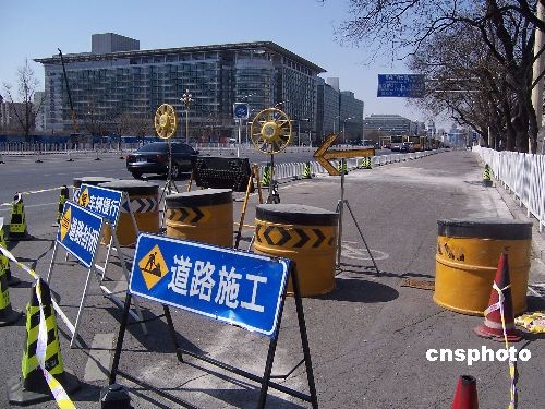 2009年3月25日,北京長安街西單文化廣場前非機動車道,近40平方米路面發生輕微沉降。事發后,該路面被交管部門臨時封閉,F場勘測人員介紹,沉降路面下方為地鐵四號線與一號線的換乘通道,此處路面沉降約1.85厘米。目前,相關工程暫停施工。中新社發 九州 攝