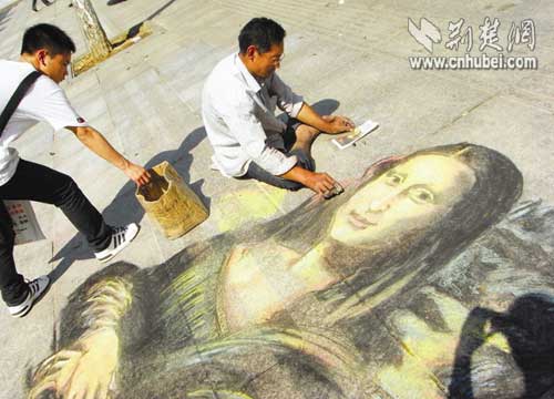 “這蒙娜麗莎畫(huà)得太像了!”昨日(15日)下午2時(shí)許,武昌中南路人行道上,一位畫(huà)者用粉筆在地上描畫(huà)的“蒙娜麗莎”,引來(lái)駐足行人的贊嘆。