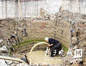 昨天,當(dāng)?shù)卣途脚扇藢ΜF(xiàn)場進行封鎖和保護,施工隊也停止了施工,為防不法商人進入古井內(nèi)掏寶,當(dāng)?shù)卣在古井旁架起隔離欄,并派民警和保安24小時值守。為確認(rèn)古井的真實身份,當(dāng)?shù)卣垇砹四暇┦胁┪镳^考古人員,對古井進行驗明正身?脊湃藛T找來抽水機,對古井里積水進行外排,井口直徑有2米多,井口邊到外是破損的殘磚碎片,工作人員用竹竿測量了一下,發(fā)現(xiàn)古井內(nèi)的積水有2米深,殘留的井壁上磚塊排列整齊。記者發(fā)現(xiàn),古井周圍全是巖石,這么個古井能打在巖石上真是不易。據(jù)現(xiàn)場一名保安告訴記者,遺憾的是由于施工時不在意,井口上半部已經(jīng)被挖掘機挖掉了至少六米以上,目前僅剩下古井的下半身4米高的距離。