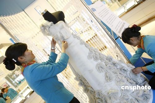 4月26日,世界上僅三件的鉑金婚紗之一亮相北京國(guó)華商場(chǎng),上面墜滿了由鉑金絲線和鉑金珠子縫制的白色花朵,吸引不少顧客的目光。這件價(jià)值75萬(wàn)美元(約合500多萬(wàn)人民幣)的“金貴”婚紗,是由國(guó)際鉑金協(xié)會(huì)邀請(qǐng)世界著名設(shè)計(jì)師Vivienne Tam經(jīng)過(guò)近一年時(shí)間的創(chuàng)作完成,她巧妙地將中西文化相融合,大膽地將中國(guó)的國(guó)花——牡丹作為創(chuàng)意元素。圖為工作人員正在整理鉑金婚紗。中新社發(fā) 鄭雄增 攝