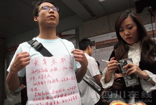 想找份好工作,就要學(xué)會(huì)推銷自己。昨(26)日上午,成都市人才市場(chǎng)門口出現(xiàn)了讓人目瞪口呆的一幕:一名25歲的小伙子身掛“求職”招牌,尋求一份年薪10萬元的工作。如此推銷自己,他也坦然承認(rèn):我就是在包裝自己而已。