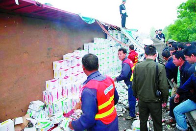 昨日(2日)上午8時,京珠高速臨長段由北往南方向125公里處,一輛裝滿牛奶的大貨車發生側翻,5000件牛奶傾覆一地。高速交警臨長大隊水渡河中隊接警后出動三個巡邏組,10余名民警趕赴現場維持秩序。