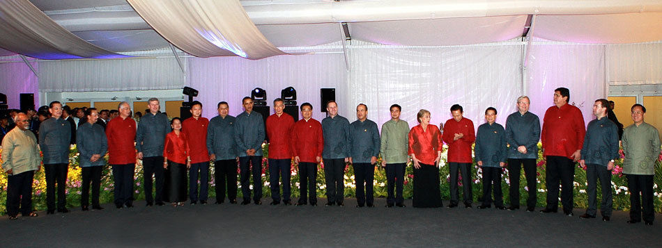 11月14日晚,出席觀看《新加坡之夜》的APEC各成員領導人拍攝了合影,剛剛抵達新加坡的美國總統奧巴馬也參加了合影。 >>點擊此處可看大圖
