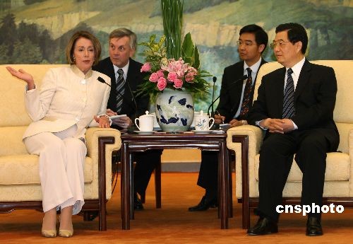 5月27日下午,中國(guó)國(guó)家主席胡錦濤在北京人民大會(huì)堂會(huì)見來華訪問的美國(guó)國(guó)會(huì)眾議院議長(zhǎng)南希·佩洛西。南希·佩洛西議長(zhǎng)應(yīng)全國(guó)人大常委會(huì)吳邦國(guó)委員長(zhǎng)的邀請(qǐng),從5月24日至5月30日到中國(guó)訪問。中新社發(fā) 任晨鳴 攝