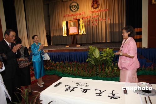 六月十二日的泰國吉拉達學校古老校園里洋溢著濃郁的中國文化氣息。在喧天的鑼鼓聲中,泰國瑪哈扎克里·詩琳通公主殿下按動電鈕,寫有“吉拉達學校孔子課堂”的牌匾徐徐拉開帷幕,標志著泰國第七家孔子課堂正式落戶這個坐落于泰國王宮里的學校。揭牌儀式上,詩琳通公主還興致勃勃地重酌墨水,揮毫為孔子課堂題寫了“學無止境 ”四個漢字,并勉勵泰國各孔子學院、孔子課堂擔當起推動泰國漢語教學進步、促進中泰友好關系發展的重任。中新社發 顧時宏 攝