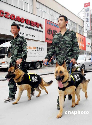 近日,浙江溫州市樂清公安局首次將警犬投入到社會治安管理中。首批4條警犬分為兩組:一組負責樂清柳市車站周邊的巡邏,另一組配合警方設卡和對可疑人員的追蹤、圍堵。2009年4月份,樂清警方專門成立了警犬基地,由保安公司負責飼養(yǎng)與日常管理。目前,警犬基地已從南京軍區(qū)購買20只警犬,每只身價都在萬元以上,多為體型強壯勻稱、勇敢無畏的德國牧羊犬。據介紹,這20只護衛(wèi)犬主要用于溫州樂清的警戒、巡邏等,其中4只首批受訓成功投入使用。中新社發(fā) 許勛磊 攝