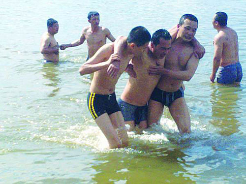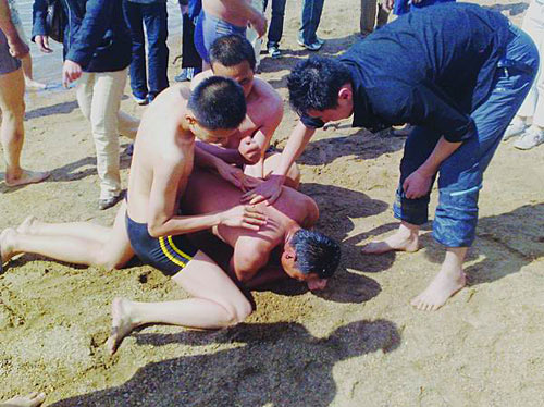 上岸之后,人們手忙腳亂地要學(xué)電視里的樣子給昏迷過去的韓德強(qiáng)擠壓心肺,小伙子再一次表現(xiàn)出來非凡的冷靜:“不能讓他仰臥!否則鼻腔里的水可能進(jìn)入腦部。”小伙子半跪在岸邊把韓德強(qiáng)俯臥著放在自己腿上,拍打他的后背將水控了出來,絲毫沒在意自己的膝蓋已經(jīng)被尖銳的沙石擦傷,流出了鮮血。