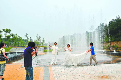 對許多人而言,墓地是忌諱之地,但21日的武漢黃陂長樂園陵園卻迎來了兩對“80后”新人,他們以陵園里的綠陰湖畔、噴泉長廊為背景,定格一個個甜蜜的瞬間。