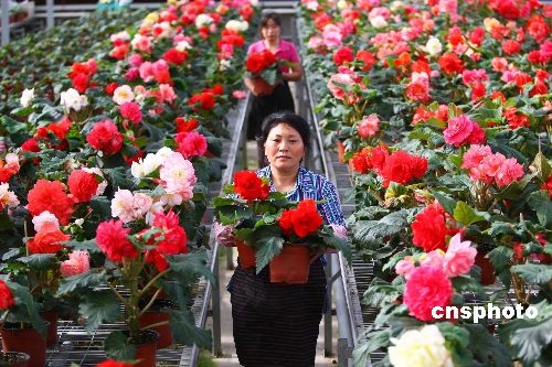6月22日,在北京草橋楊鎮花卉基地一位花卉工人正在手捧朝鮮“金正日花”從海棠花中走過。據草橋基地負責人介紹“金正日花”屬于海棠科多年生球根花,是日本花卉專家加茂元照經過多年研究培育出來的。在1988年送給朝鮮領導人金正日,作為領袖46歲生日的禮物,并以金正日命名。民眾可以在今年9月26日召開的第七屆中國花卉博覽會上一睹它的芳容。為了確保“金正日花”能在花博會上如期盛開,楊鎮草橋基地專門從朝鮮聘請了3名專業技術人員,他們對“金正日花”的生長溫度、適度控制非常嚴格,給花澆水、施肥都要按照嚴格的標準執行。目前,“金正日花”長勢喜人。中新社發 富田 攝
