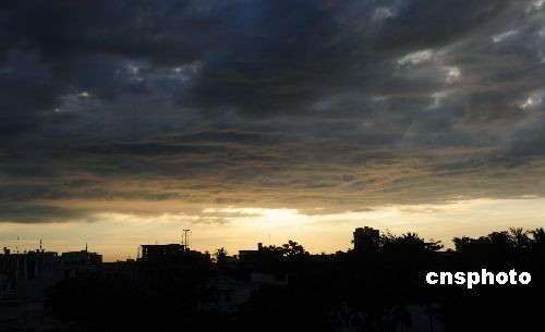 6月26日早晨5時(shí),2009年第4號熱帶風(fēng)暴“浪卡”(NANGKA)的中心位于東沙島偏南方大約220公里的南海東北部海面上,中心附近最大風(fēng)力有8級(20米/秒)。預(yù)計(jì),風(fēng)暴中心將以每小時(shí)15-20公里的速度向西北方向移動(dòng),將于6月26日夜間到27日上午在廣東惠來到珠海一帶沿海登陸,登陸后強(qiáng)度迅速減弱。中新社發(fā) 蒙鐘德 攝