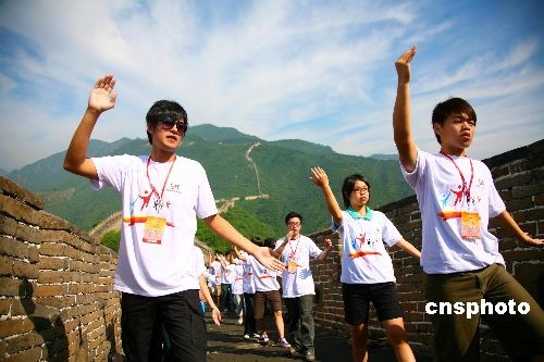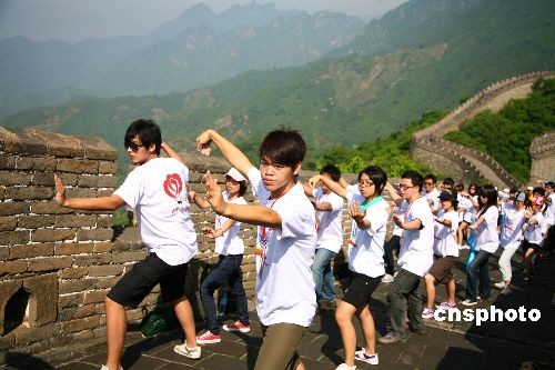 7月15日,兩岸青少年正在北京懷柔慕田峪長(zhǎng)城舞太極。當(dāng)日,北京市人民政府臺(tái)灣事務(wù)辦公室與懷柔區(qū)人民政府在懷柔慕田峪長(zhǎng)城舉辦“兩岸青年舞動(dòng)太極聚長(zhǎng)城”活動(dòng),臺(tái)灣大學(xué)、臺(tái)中技術(shù)大學(xué)、基隆市二信中學(xué)、嘉義東石學(xué)校、新竹中信學(xué)校等院校的學(xué)生,國(guó)民黨青年發(fā)展基金會(huì)、臺(tái)灣工藝發(fā)展協(xié)會(huì)等社會(huì)團(tuán)體組織成員,與北京600余名師生歡聚長(zhǎng)城共舞太極。本次活動(dòng)是“青春牽?jī)砂叮甏缶凼住┡_(tái)青少年交流周”活動(dòng)重要組成部分,旨在發(fā)揚(yáng)中華民族傳統(tǒng)文化,聯(lián)絡(luò)兩岸師生感情,讓長(zhǎng)城見證兩岸青少年的友情地久天長(zhǎng)。中新社發(fā) 卜向東 攝