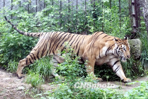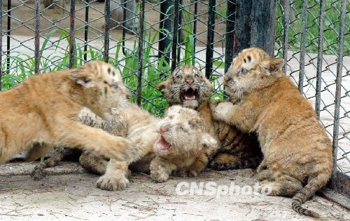 7月20日,在濟(jì)南野生動物世界,剛出生2個(gè)月的四胞胎小老虎首次走出產(chǎn)房與游客見面。據(jù)了解,該景區(qū)飼養(yǎng)的孟加拉虎“虎妞”于5月10日產(chǎn)下四胞胎,其中兩只是金虎,一只雪虎,一只孟加拉虎,專家介紹,一胎產(chǎn)下3個(gè)品種的虎崽,在國內(nèi)還是首次出現(xiàn)。另據(jù)了解,虎有3種基因的顏色,黑色、黃色和白色,其中黑色與黃色是顯性基因,白色為隱性基因,當(dāng)黃色基因不能表達(dá)時(shí),被白色基因掩蓋,就生出白虎,黑色與黃色基因都沒有表達(dá)時(shí),白色基因就成為顯性基因,就生出雪虎,當(dāng)白色與黑色基因變成隱性基因時(shí),就會生出金黃色的虎,也稱為“金虎”。中新社發(fā) 龔輝 攝