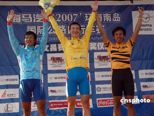 11月5日,“海馬汽車”2007環海南島國際公路自行車賽舉行第二賽段興隆—文昌賽段。俄羅斯選手(中)丹尼斯·格林姆西亞諾夫蟬聯個人總成績領先者、沖刺積分領先者兩個獎項,馬來西亞選手阿奴爾·馬南(右)獲得第二賽段分段冠軍,中國國家隊選手馬海軍(左)蟬聯亞洲最佳選手。中新社發 彭小云 攝