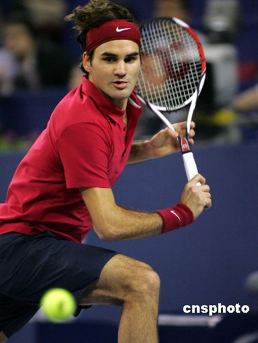 11月16日,在2007年上海大師杯單打紅組最后一輪比賽中,費德勒以6-4/6-2擊敗羅迪克,以小組第一挺進(jìn)四強,費德勒在半決賽中將對陣納達(dá)爾。中新社發(fā) 湯彥俊 攝