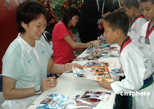 12月12日,前來三亞參加2007“蘭海杯”第三屆中韓跆拳道對抗賽的奧運冠軍陳中、羅薇,在三亞“美麗之冠”進行簽贈活動,受到許多跆拳道愛好者的熱烈歡迎。中新社發 尹海明 攝